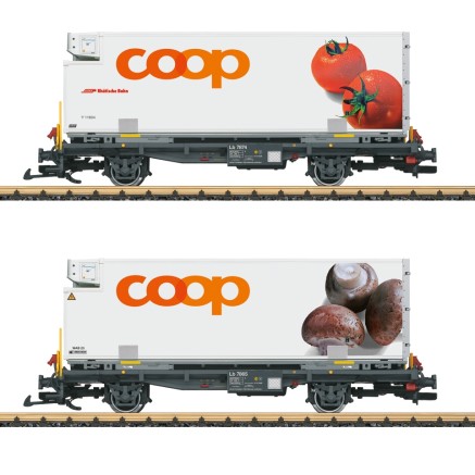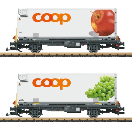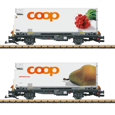 2er Set Containertragwagen Lb der Rhätischen Bahn, beladen mit je einem Kühl-Container der "Coop".