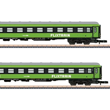 Set aus zwei FLIXTRAIN Reisezugwagen der Typen Bmmdz 268.7F und 264.4F. Die Vorbilder gehören der Firma Trainpool und sind an FLIXTRAIN vermietet. Die Wagen besitzen eine werkseitig eingebaute Innenbeleuchtung.